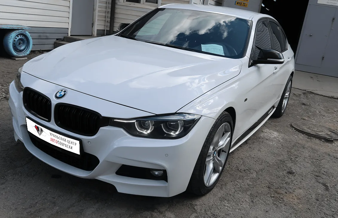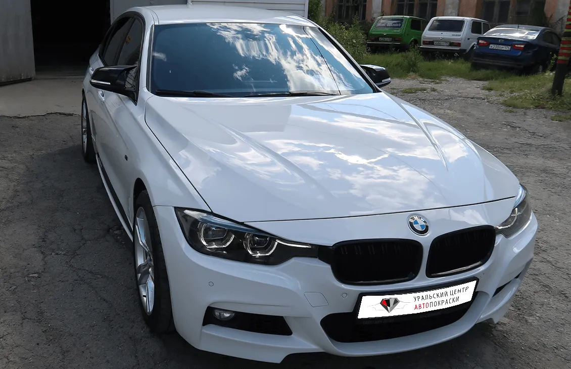Косметический кузовной ремонт BMW 3: окраска капота, крыльев и бампера, локальное восстановление сколов и частичная покраска задней части.