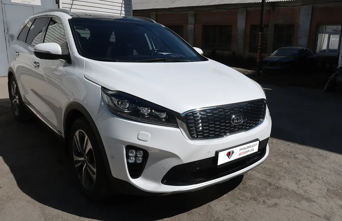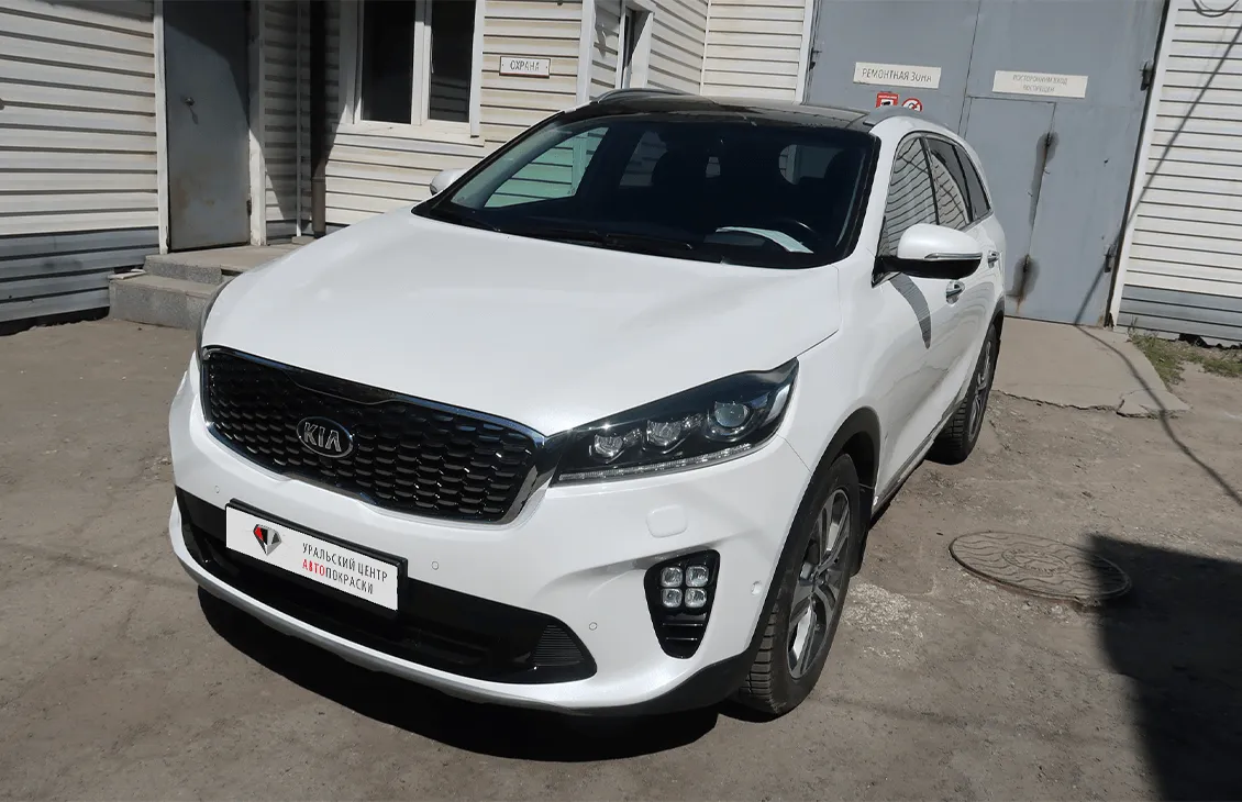 Ремонт передней части Kia Sorento с устранением перекоса кузова. Заменены капот, крылья, бампер и панель, восстановлены лонжероны и геометрия кузова.