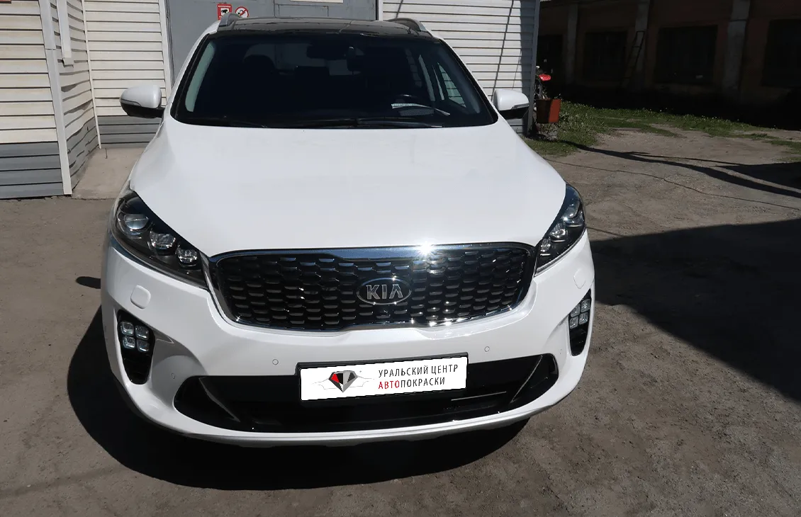 После детального осмотра автомобиля Kia Sorento специалисты выявили комплексные повреждения передней части кузова. Были деформированы передние крылья, капот, бампер и панель, а также нарушена геометрия переднего сегмента, включая проём капота и лонжероны.
